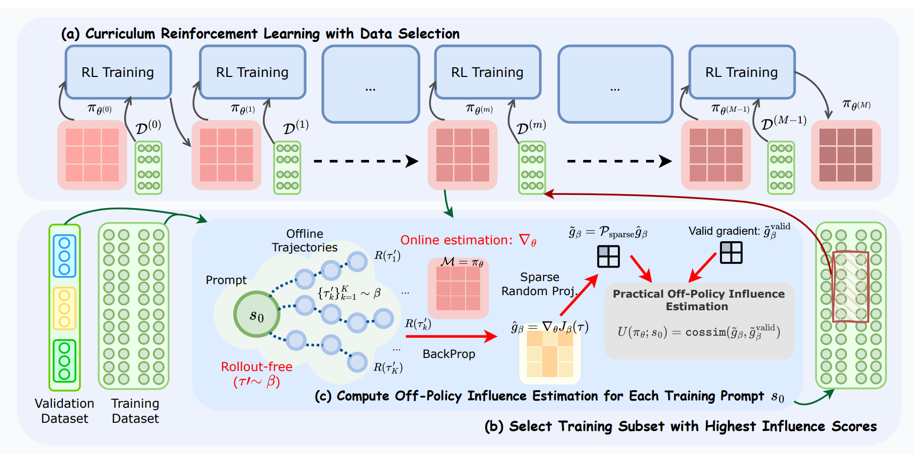 This paper argues that the right fix isn’t another heuristic notion of “hardness,” but a principled measure of how much each prompt actually moves the current policy. The core move is to import influence functions into RLVR and compute a per-prompt influence score from gradients, then use those scores to drive data selection. The catch, of course, is that on-policy gradients are expensive to get in RL.