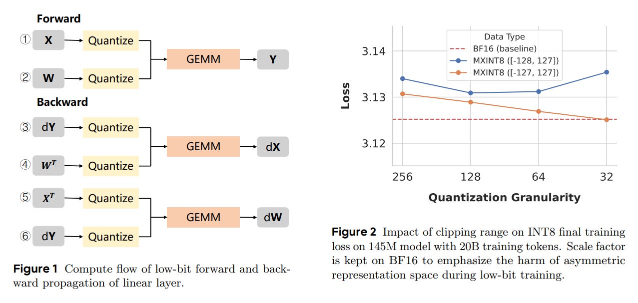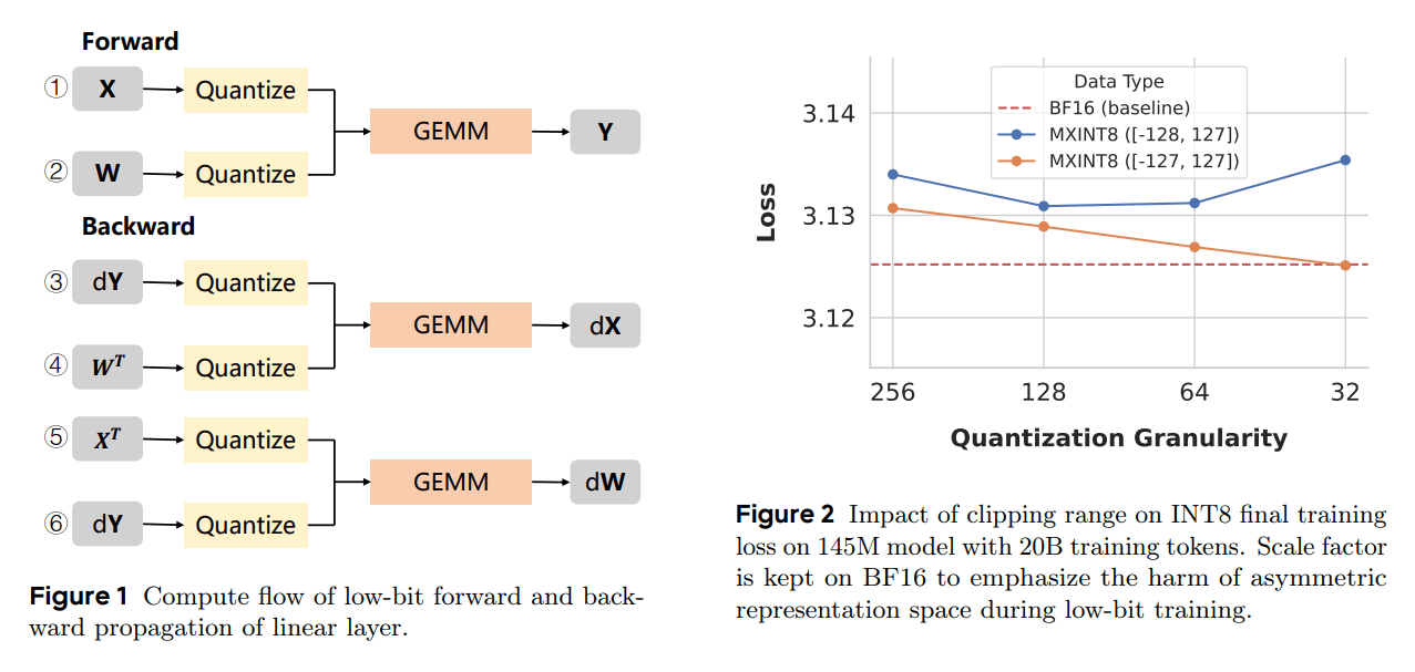 A symmetric clipping rule removes the small but consequential bias that INT can introduce during backprop at fine granularity. They also highlight a pitfall in using BF16 to compute INT scales: a non-trivial fraction of values mis-map to −128 without a forced symmetric clamp.
