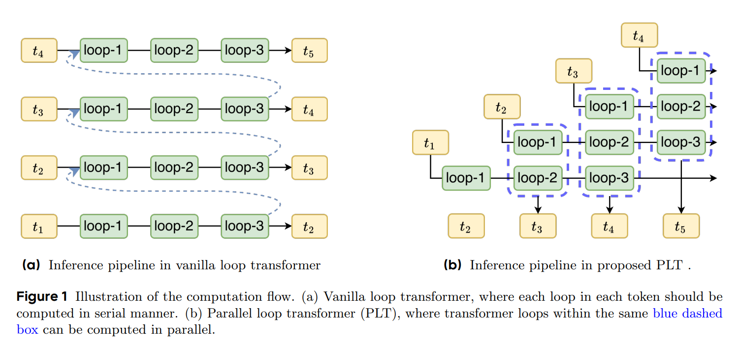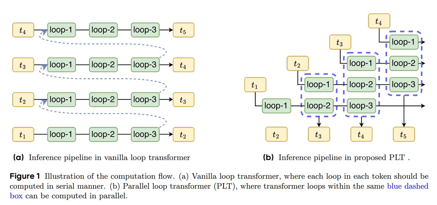 It proposes a cross-loop parallelism (CLP), which schedules different loop iterations on adjacent tokens within a single forward pass, and an “efficient representation enhancement” that avoids ballooning the KV cache by sharing the first loop’s cache and fusing it with a local sliding-window path. In short, PLT tries to get most of the depth benefit of looping at near-vanilla latency and memory.