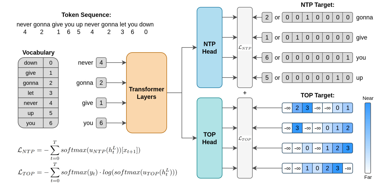 This paper introduces Token Order Prediction (TOP), a new auxiliary objective that predicts the relative order of upcoming tokens using a ranking loss, rather than their exact identities. Unlike MTP, TOP encourages future-aware internal representations without increasing model complexity or relying on brittle architectural choices. It’s designed to strengthen next-token prediction while avoiding the over-specification and inefficiencies inherent in MTP.