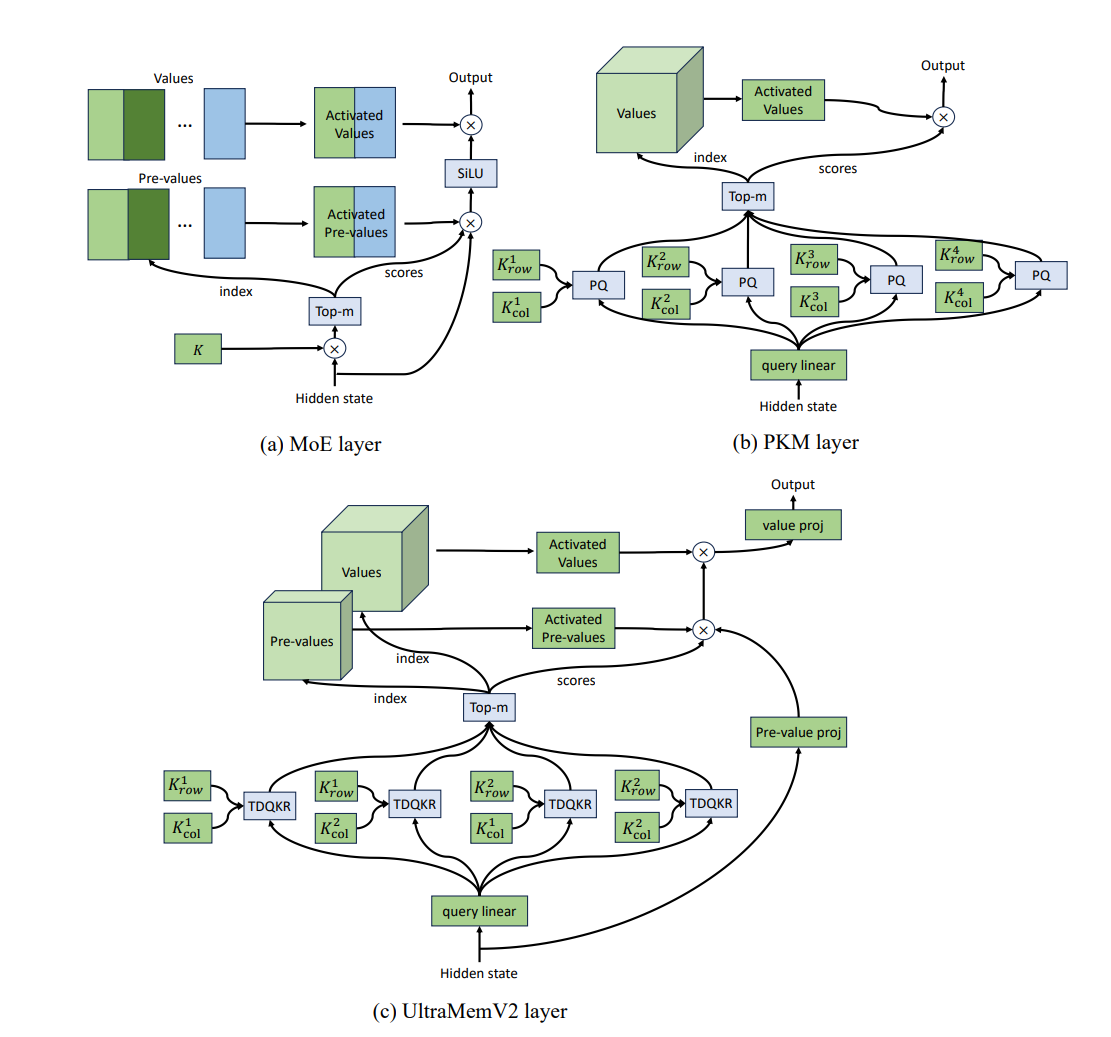 To close this gap, the authors introduce UltraMemV2, a redesigned memory-layer model that incorporates tighter integration with Transformer blocks, streamlined value processing, expert-like FFN computation, optimized initialization, and better compute balancing. These enhancements enable UltraMemV2 to match 8-expert MoE performance while preserving the low-memory-access advantages of memory layers.
